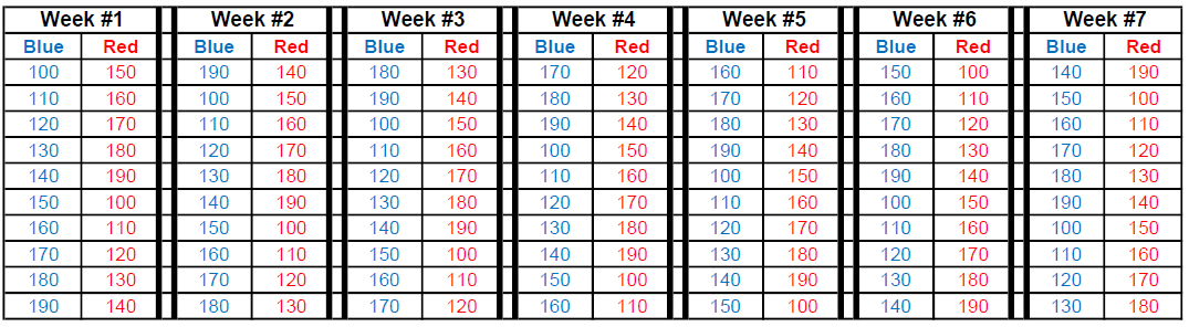 Each week bib numbers will rotate down. The last numbers on each side will flip to the top.